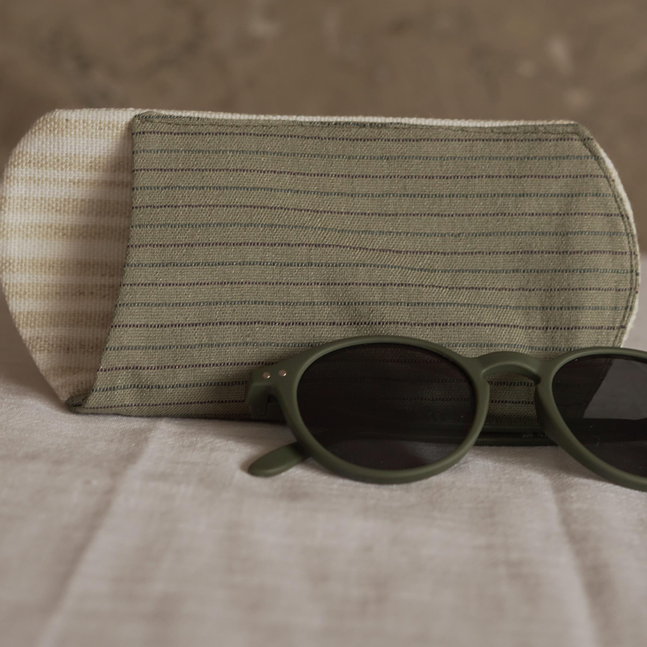 Gözlük kılıfı; bir yüzü barış ipeği, bir yüzü pamuk kumaş ve elyaflı modeli ile gözlükleri çizilmelere karşı korur.