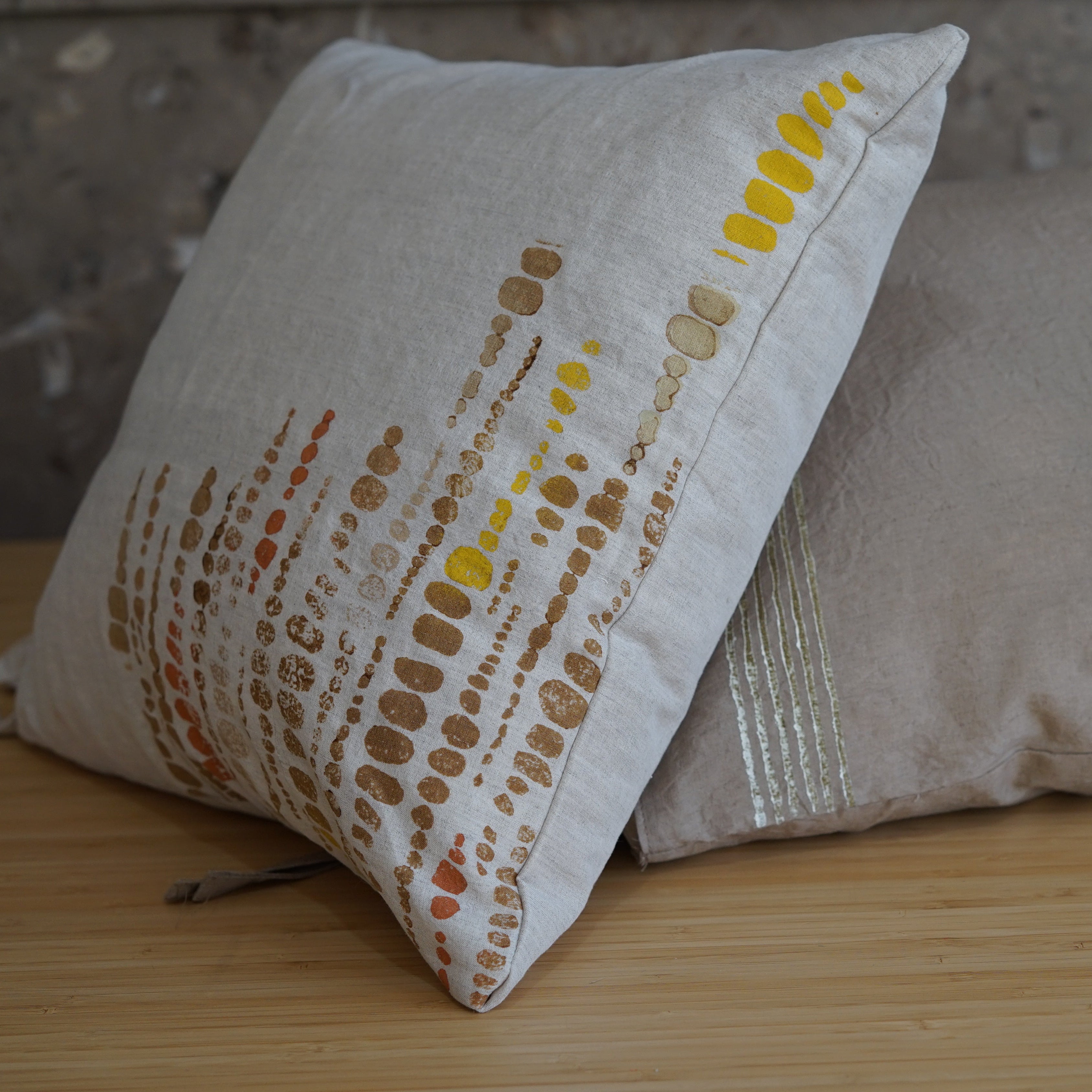Kırlentimiz 43*43 cm ve 30*50cm el dokuması, elde bitkisel boyama ve elde ıhlamur baskı ile üretilmiştir.